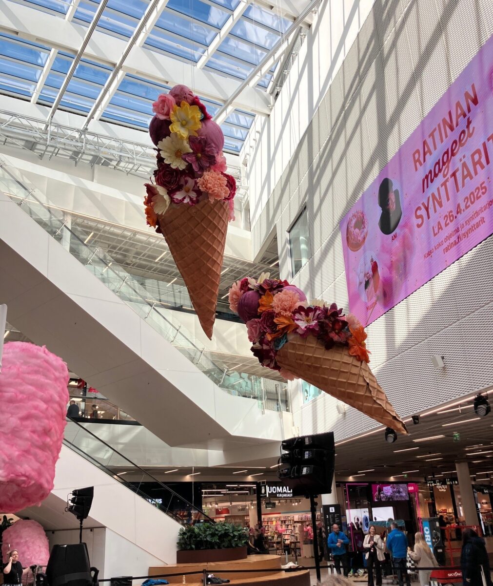 Vasen kuva: 4,5-metriset jäätelökukat Ratinan kauppakeskuksessa Tampereella.