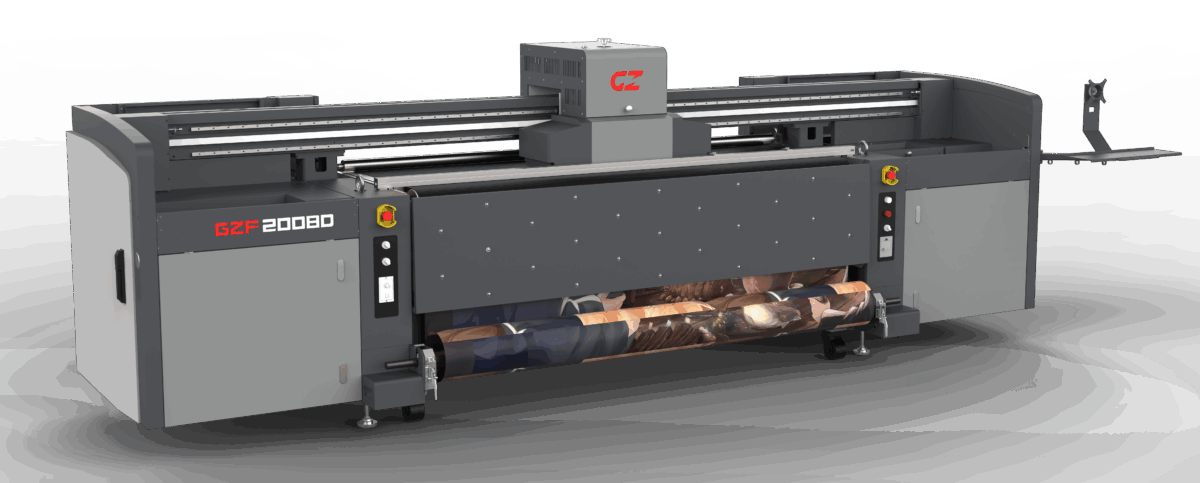 GZF2008D Hybridi UV -tasotulostin RICOHIN Gen6 hedeillä, huippulaatu. max. tulostusleveys 200 cm. Voit tulostaa myös 6m2 levyn lyhyt sivu edellä.